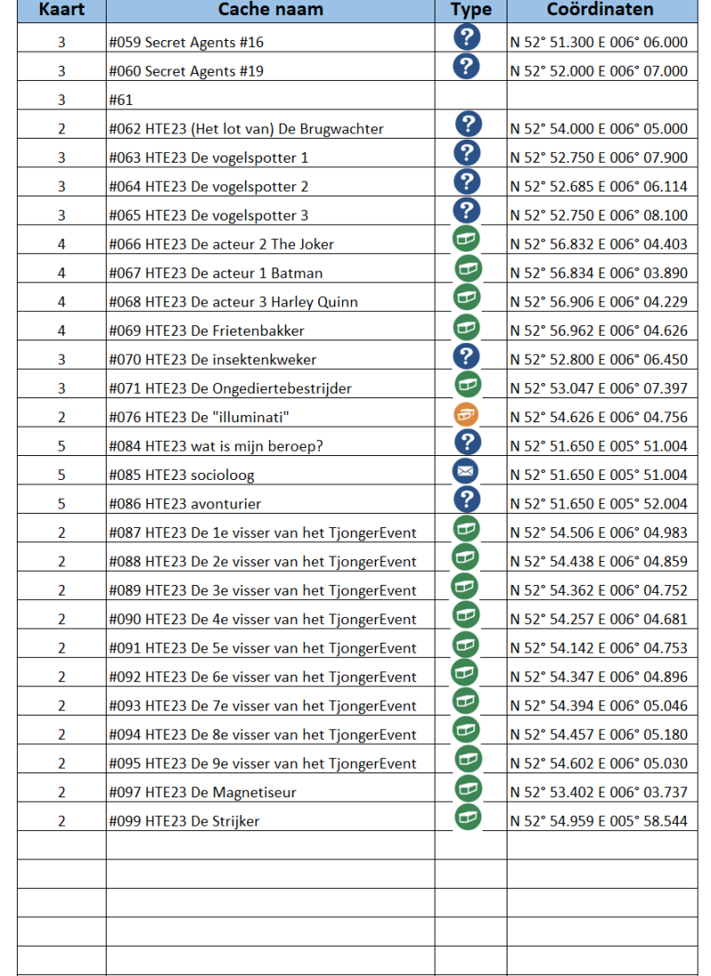 De onderstaande coördinaten van de volgende cache types zijn fictief: