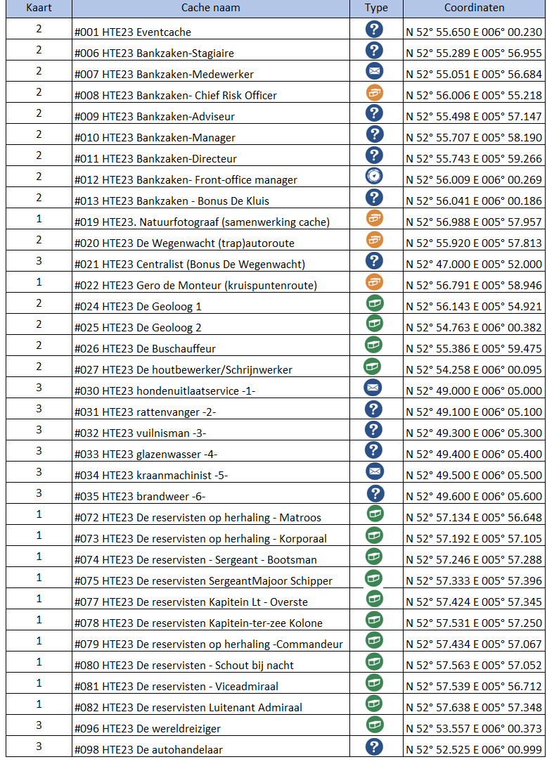 De onderstaande coördinaten van de volgende cache types zijn fictief: